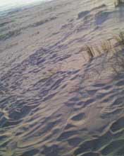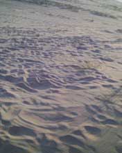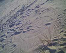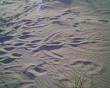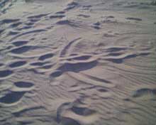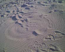 notez la forme et sa topologie bien particuliere. le climat etait au beau fixe,les brises ë vent cotier souflaient moyens ces jours là è le sable sec,d'1 jaune asse soutenu et fin, j'ai deduis quelle devait avoir env. 1semaine vu le sable contenu ds ses sillons,chose remarquable l.'empreinte fut preserve du pietinement de temoins precedents