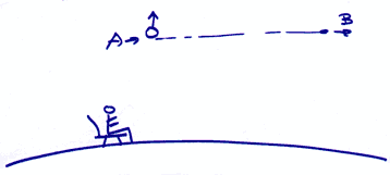 Au-dessus de nos têtes, nous avons remarqué (A) un objet lumineux de la grosseur apparente d'un citron (+/-), immobile, ne scintillant pas, mais plus gros que les étoiles. Un autre point lumineux (B), de la grosseur apparente d'une cerise (+/-), s'est détaché de cette boule et a traversé le ciel. Il avait l'air de suivre la courbure de la Terre et a disparu très loin, au-delà de l'horizon.