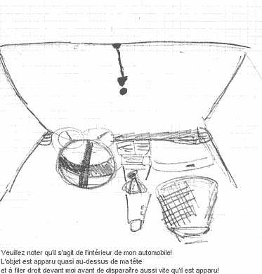 Je fus tellement fasciné et abasourdi par ce phénomène inexplicable que je l'ai observé pendant 10 minutes! Ça ressemblait à une sorte d'objet ovale, hyper allongé, avec à chaque extrémité une rangée d'une dizaine de petites lumières qui à temps régulier (toute les +- 5 sec) flashaient, ce qui m'éblouissait et m'empêchait de m'approcher. Soudain je fus réveillé vers 19h00 du soir le lendemain! En oubliant tous les autres faits passés à la suite du récit que je viens de vous faire part!