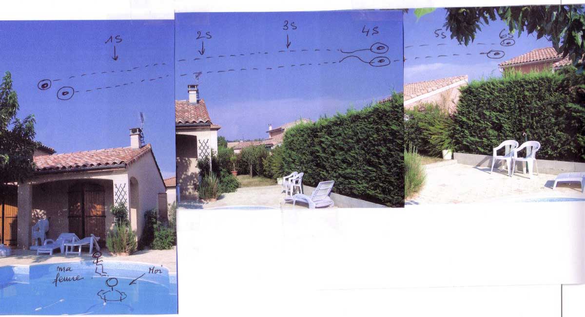 J'ai fait un petit montage photo et dessiner à la main sur les photos pour montrer un semblant de trajectoire et la position des témoins.Etant ingénieur en système informatique, j'ai donc une formation scientifique aussi bien en informatique, qu'en électronique et en même en aéronautique. J'ai toujours été passionné par l'astronomie. Depuis l'âge de 15 ans, je me suis toujours intéressé au phénomène des OVNI, mais je n'avais rien vu de mes propres yeux. Donc, malgré mon intérêt et mon désir d'y croire, je gardais secrètement toujours un doute sanitaire: ce ne sont que des canulars!