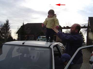 Hier après-midi (lundi 2 février 2004 à 13h25) nous avons photographié notre petite fille, un peu comme le font beaucoup de parents (avec un appareil numérique, cadeau du père Noël) et lorsque nous avons regardé les photos sur notre ordinateur, nous avons observé sur l'une d'entre elles un petit disque noir à l'horizon juste au-dessus de la tête de notre petite fille.