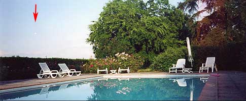 Nous n'avons pas réussi à voir le point lumineux, même en agrandissant la photo - GREPIAu début j'ai pensé à un reflet ou défaut du dévelopement, mais sur cette photo il y a la piscine de la propriété où j'habitais et, gros coup de chance, sur cette deuxième photo il y a le reflet de ce même point lumineux visible à la surface de l'eau, donc pour moi il n'y a pas eu un défaut photo, pourtant j'affirme ne rien avoir vu au moment de ces photos (photos dont je dispose sans pour autant être extraordinaires), mais être tout de même troublante.