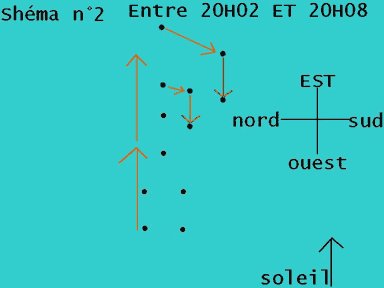 Ce qui m'a étonné c'est que le point lumineux s'est déplacé au bout d'un moment, lentement, en hauteur, puis redescendu. Ensuite il est remonté à nouveau un peu plus vite et plus haut. J'ai demandé à mon père ce que ça pouvait être, il me répondit que ça devait être une sonde météo qui prenait des mesures de la qualité de l'air. Alors j'ai trouvé jusque là normal, c'est qu'ensuite, le point lumineux, après être monté plus haut, s'est déplacé en direction du sud-est et volait comme un avion avec 2 ou lumières qui sont apparues. Mais ça ne faisait pas de bruit.