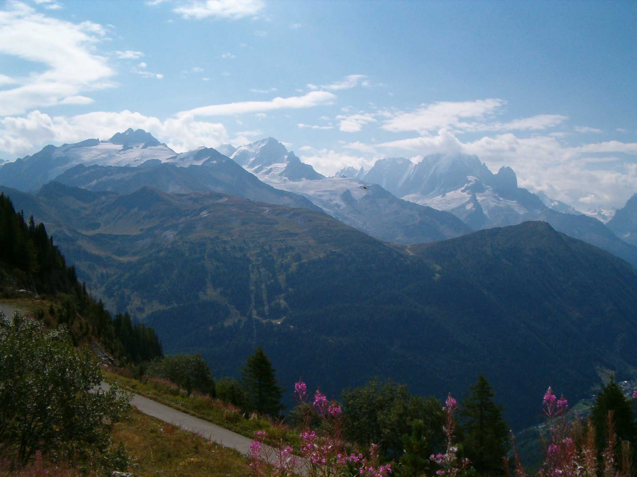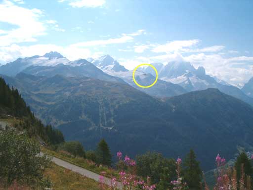 Voici deux ans (le 24 août 2003 - 10h30, selon la date de création du fichier), j'ai pris une photo du massif du Mont-Blanc en montant au barrage d'Emosson. En visionnant la photo une tache apparaissait mais je l'ai négligée. Ce week-end, j'ai agrandi cette tache. La forme, la couleur... elle pourrait faire penser à un OVNI.