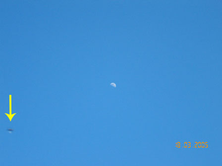 Alors, moi ça s'est passé vers 16h, mon père venait de rentrer du travail et m'a fait remarquer une sorte d'étoile dans le ciel. Mais à 16h c'est quand même bizarre d'en voir. Le ciel était complètement bleu. Ensuite j'ai pris mes jumelles pour mieux voir l'engin, et j'ai pu voir une sorte d'objet métallique (un peu comme une demi-soucoupe ou un cigare). L'objet brillait très fortement, probablement à cause de la lumière du soleil qui se reflétait. Il était totalement immobile et n'était pas entraîné par la rotation de la Terre. Peut-être que cet objet était un satellite, je n'en sais rien, mais en tout cas je n'en ai plus jamais revu. Contrairement à la plupart des témoignages, cet objet est resté très, très longtemps et avec l'arrivée de la nuit il s'est fondu dans les étoiles et je l'ai perdu.