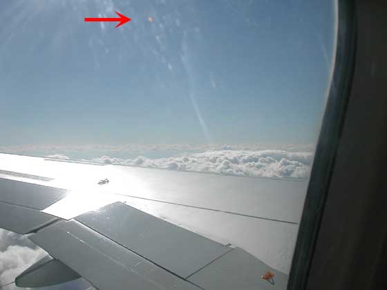 J'ai une photo prise lors d'un vol en avion ligne Air France, vol entre Montpellier et Clermont-Ferrand, France, le 5 octobre 2003 (vol 15h10>16h40). Cette photo est une vue du ciel au-dessus d'une mer de nuages couvrant le Massif Central avec en fond l'apparition d'un point sphérique. Si on tient compte d'une éventuelle déformation du hublot, il peut s'agir de la lune. Qui pourrait me dire si la lune était visible à cette heure à 290°? Je n'ai rien remarqué à ce moment-là. Je viens seulement de voir, en plaçant cette photo en fond d'écran sur mon Bureau Windows d'ordinateur, cet étrange élément. Bien entendu, j'assure que cette photo n'a subi aucune retouche. Je tiens la photo à votre disposition.Vous trouverez ci-joint 3 photos. La photo n° 2 est la photo "qui me pose problème", les deux photos 1 et 3 prises juste avant et après la précédente ne sont adressées que pour mettre en évidence une éventuelle déformation du hublot de l'avion, de l'objectif si c'était le cas (je n'en vois aucune). Avec un petit programme appelé Winstars, j'ai pu vérifier que la lune n'était pas visible à ce moment-là (sauf erreur de ma part).