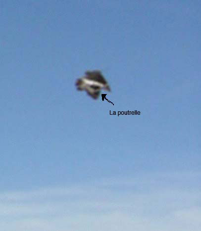 Si c'est bien cela, nous voyons un oiseau, pas vous? - GREPIMerci de votre réponse... par contre vous n'avez pas essayé de grossir l'image!!! (si, si! - GREPI) Je suis quand même étonné de votre réponse, c'est sûr que ça n'est pas un oiseau... Pardon, ça n'est effectivement pas à gauche mais bel et bien à droite, l'objet que vous avez cercle en rouge. Ci joint l'image grossie, et avec mon frère graphiste nous avons suivi les contours et mis les couleurs correspondantes, de plus, en grossissant la photo on distingue très clairement une poutrelle grise de style métallique qui part du fuselage au gros carré qu'il porte sur le dos, qui pour moi ressemble fort à un panneau solaire... Aucun oiseau n'a une barre aussi précisément droite... Aucun oiseau n'a un carré sur le dos si précis!!! De plus, on distingue clairement que ça n'est pas un oiseau car l'objet est beaucoup plus gros... De plus, j'ai pris cette photo, donc l'appareil était en face de moi et je n'ai rien vu... Je suis observateur, s'il y avait quelque chose dans le ciel je l'aurais vu???