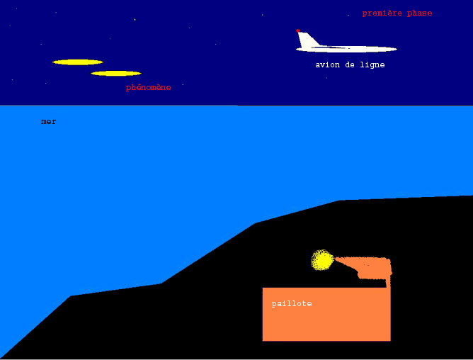 J'étais sur le pont arrière du bateau en compagnie d'environ cinquante personnes, quand les conversations s'arrêtèrent: un objet brillant, long, avec une bulle orange sur le devant, se trouvait immobile au-dessus de la presqu'île de Crozon. Le jour n'était pas encore levé. L'engin paraissait très long.