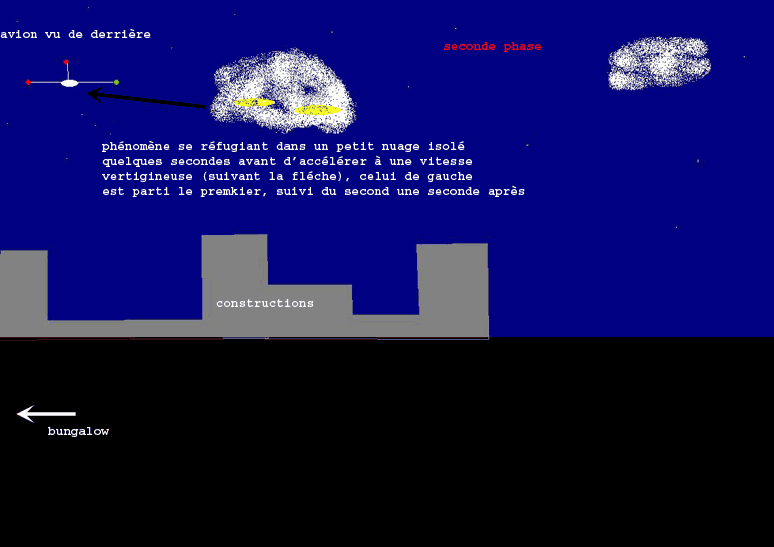 Soudain j'ai aperçu deux halos de lumière de forme parfaitement circulaire en formation l'un derrière l'autre, arrivés derrière l'avion. J'ai eu à peine le temps de m'apercevoir qu' ils étaient argentés au-dessus. Ils ralentissaient pour pénétrer dans un petit nuage solitaire, où je voyais bien leur lumière se dégager, sans illuminer autour d'eux. Restés statiques environ deux secondes, ils ont filé d'un coup à une vitesse vertigineuse dans une autre direction. J'ai entendu comme un léger sifflement et puis plus rien. Mon oncle se retourna et me demanda ce que j observais. Je lui répondis que je regardais l'avion s'éloigner.