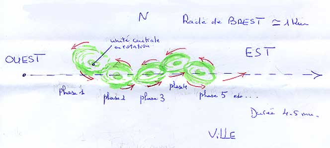Toute notre famille est sortie de la maison pour voir. J'ai oublié de préciser que le ciel était dégagé, seuls quelques nuages par plaques obstruaient le ciel par-ci par-là. Mais nous avons donc bien vu un engin qui était plus brillant que la plus brillante des étoiles visibles dans le ciel. Cet engin se déplaçait sans bruit, et surtout se déplaçait en ZIGZAGS plus ou moins fermés. De plus, il laissait derrière lui une traînée lumineuse laiteuse qui avait une distance constante, je veux dire par là que la fin de cette traînée lumineuse s'effaçait à la même vitesse que l'engin avançait. Il y avait peut-être entre l'engin lui-même et la fin de la traînée trois ou quatre ZIGZAGS complets en permanence.