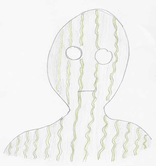 Je n'ai pas retenu grand chose de son visage parce que c'est autre chose qui m'a frappé. C'est que son corps (du moins la partie de son corps que j'ai vu), y compris son visage, était parcouru de fines stries (1 à 2,5mm) jaune pâle (ci-joint un dessin que j'ai fait, veuillez excuser mes piètres talents de dessinatrice).