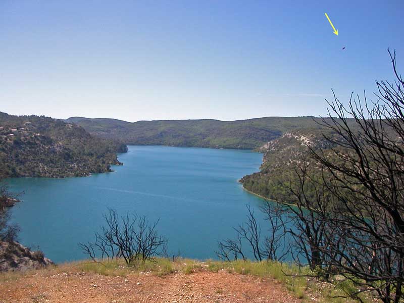 Sur le chemin je me suis arrêté sur le bord de la route pour prendre des photos à un endroit où on domine le lac et ciel bleu magnifique. J'ai pris quelques photos de cet endroit, et le jour même je n'ai rien vu. En rentrant chez moi, j'installe les photos sur mon PC. Un mois et demi plus tard, le 14juillet, j'ai assisté au feux d'artifice de Gréoux les Bains, j'ai aussi fait des photos que j'ai installé sur mon ordi et j'ai passé en revue tous mes clichés. Quand arrive la photo en question, mon regard est attiré par un objet bizarre dans le ciel, je n'en ai jamais vu de tel, ce n'était ni un avion, ni un hélicoptère, oiseau, tache sur l'objectif. On dirait une soucoupe volante, il en a la forme, on dirait qu'il est argenté, je ne pense pas que ce soit un ballon sonde, ça m'intrigue beaucoup, est-ce vraiment un ovni??? et je ne sais pas à quelle vitesse il se déplaçait.