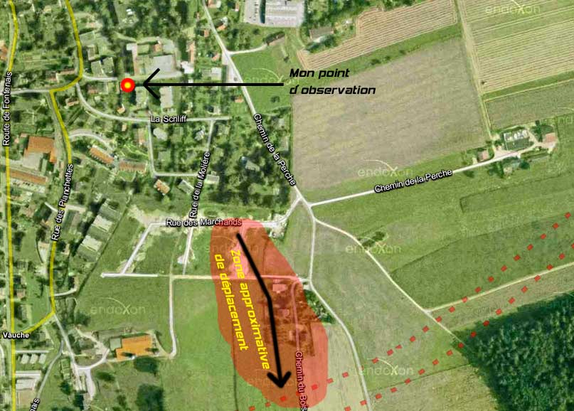 Quelle fut la durée totale de l'observation, de chacune de ses phases? Arrivée rapide horizontale 2 secondes, stationnement 5 à 10 secondes, puis mouvements lents dans une trajectoire aléatoire 10 à 15 secondes (quelques mouvements ascendant et horizontaux) mouvement rapide 2 secondes, stationnement 5 à 15 secondes, mouvement rapide vers la droite, en moins de 2 secondes, et disparition derrière une ligne d'arbres éloignés.