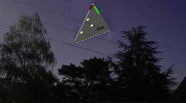Je décide donc de regarder par la fenêtre de mon bureau pour essayer d'apercevoir l'objet... je ne vois rien... quelques secondes plus tard le grondement semble se rapprocher encore, je décide donc de regarder à nouveau par la fenêtre, et là... j'en tremble encore, j'ai pu observer pendant environ 5 secondes un immense triangle gris ardoise avec trois projecteurs blancs de forte puissance ainsi qu'une barre de lumière verte sur le côté droit de l'objet, et plusieurs petits projecteurs disséminés sur l'ensemble. L'objet se déplace très lentement, 60 km/h d'après mon estimation, sur une trajectoire allant du nord-est vers le sud-ouest, à très basse altitude, je dirais moins de 500 mètres, le ciel est clair et dégagé, pas de vent, bonne visibilité. Quant à l'objet, il semble mesurer plusieurs centaines de mètres. Je pense être à ce moment-là à 1 ou 2km maxi de l'objet. Pris de panique je décide de saisir mon appareil photo, et de réveiller ma petite amie pour observer le phénomène depuis la fenêtre de la chambre... Hélas, le temps que je change de pièce et que je réveille ma compagne, je perds l'objet de vue... depuis la fenêtre de la chambre je ne vois plus l'objet, mais j'entends toujours le grondement, qui s'éloigne très lentement, cela va durer encore 5 bonnes minutes, mais sans contact visuel.