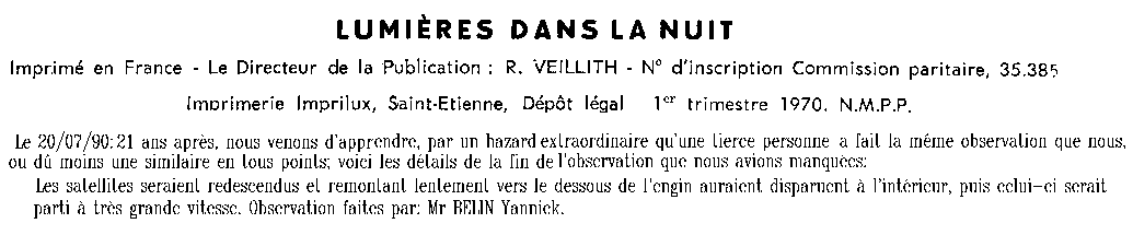 - Oui, on se croyait isolés tous les 3, mais je me suis aperçu quelques mois plus tard que d'autres ont vu cet objet à l'oeil nu et ont averti les autorités. Ce que nous n'avons jamais fait pour notre part. Nous avons envoyé notre observation à la société astronomique qui en a publié un résumé et grâce à un collègue de lycée qui lui était "branché", nous l'avons envoyé à Lumières Dans La Nuit. 20 ans plus tard, nous avons appris par des tiers qu'une personne possédant un télescope a fait la même observation (de 1969). Il s'agit de Y. B. dont nous n'avons pas pu retrouver le témoignage direct. Dommage!