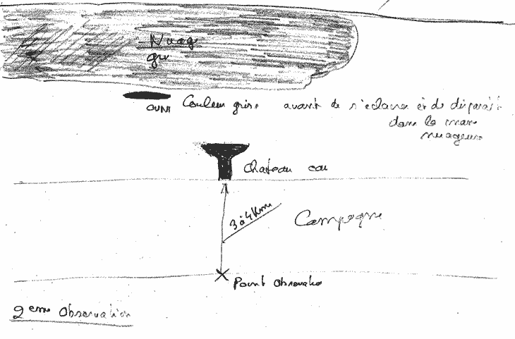J’ai reconnu sa forme mais il semblait gris foncé, il tranchait sur le ciel qui était lui aussi gris dans cette direction. Il me semblait plus éloigné que le château d’eau et nettement plus haut. J’ai pu l’observer quelques secondes; il est devenu alors plus lumineux et cette lumière paraissait naturelle. J’ai remarqué des variations comme si des nuages passaient devant et, soudain, il a disparu, comme absorbé par le ciel gris. J’ai pu l’observer vingt secondes environ.