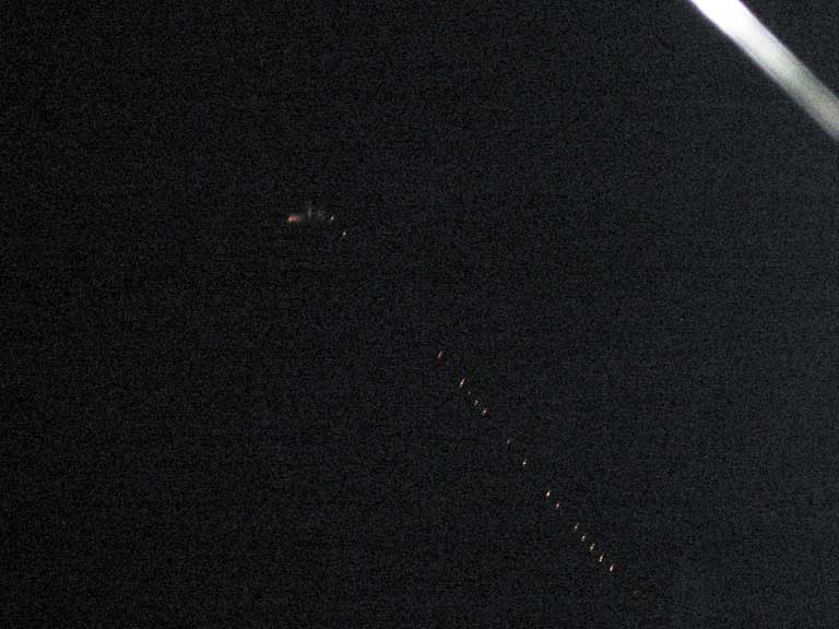 cliquer pour voir la photo originale, non retouchée, grande tailleJe vis alors l'objet bouger vers le haut à gauche. Ça n'a duré qu'un bref instant, quelques secondes à peine. L'espèce de rai de lumière discontinue me donna l'impression d'être une sorte de filet étirable qui finit par se faire happer par l'objet, qui disparut soudain comme dans un tourbillon.