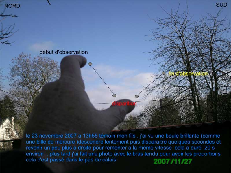 Comment l'observation s'est-elle terminée? L'objet s'est dématérialisé en une fraction de seconde et il n'a pas disparu derrière l'horizon car vu l'heure de l'observation et vu qu'il a traversé la Grande Ourse, il n'était pas haut niveau de l'horizon.