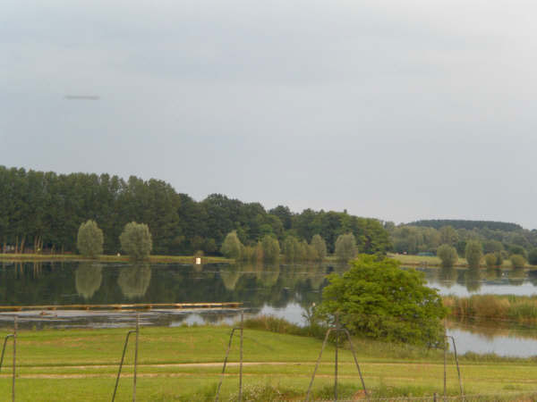 Une "constellation de six étoiles" figurant une raie, c'est-à-dire quatre en losange + deux en ligne à l'arrière, traversait le ciel à vitesse "satellitaire". La formation, en tout large comme la main à bout de bras, observée par ma compagne de l'époque et moi-même pendant environ douze à quinze secondes, fut ensuite cachée par les nuages au-dessus de la citadelle (de Calvi, donc…).Mais le plus fort c'est que, depuis trois jours (nous sommes le 14.06.2008), je parcours votre section témoignages» avec grand intérêt et je suis allé faire un tour, appareil numérique à la main, à Bourges près du plan d'eau. Je me disais que, bien qu'ils semblent se soustraire à notre regard, il n'en est pas de même pour nos appareils photos qui parfois les saisissent en plein "vol", et c'est dans cet état d'esprit que je shoote les alentours en me disant: "Allez les gars, montrez-vous!" Bref, quelques minutes de photos, environ vingt clichés et je rentre, lis encore quelques pages de la section «témoignages», puis je pense à regarder les photos de cet après-midi, et là.... je sais que c'est pour "ça" que j'y suis allé, mais de là à ce que ça se concrétise... abasourdi!!!!
