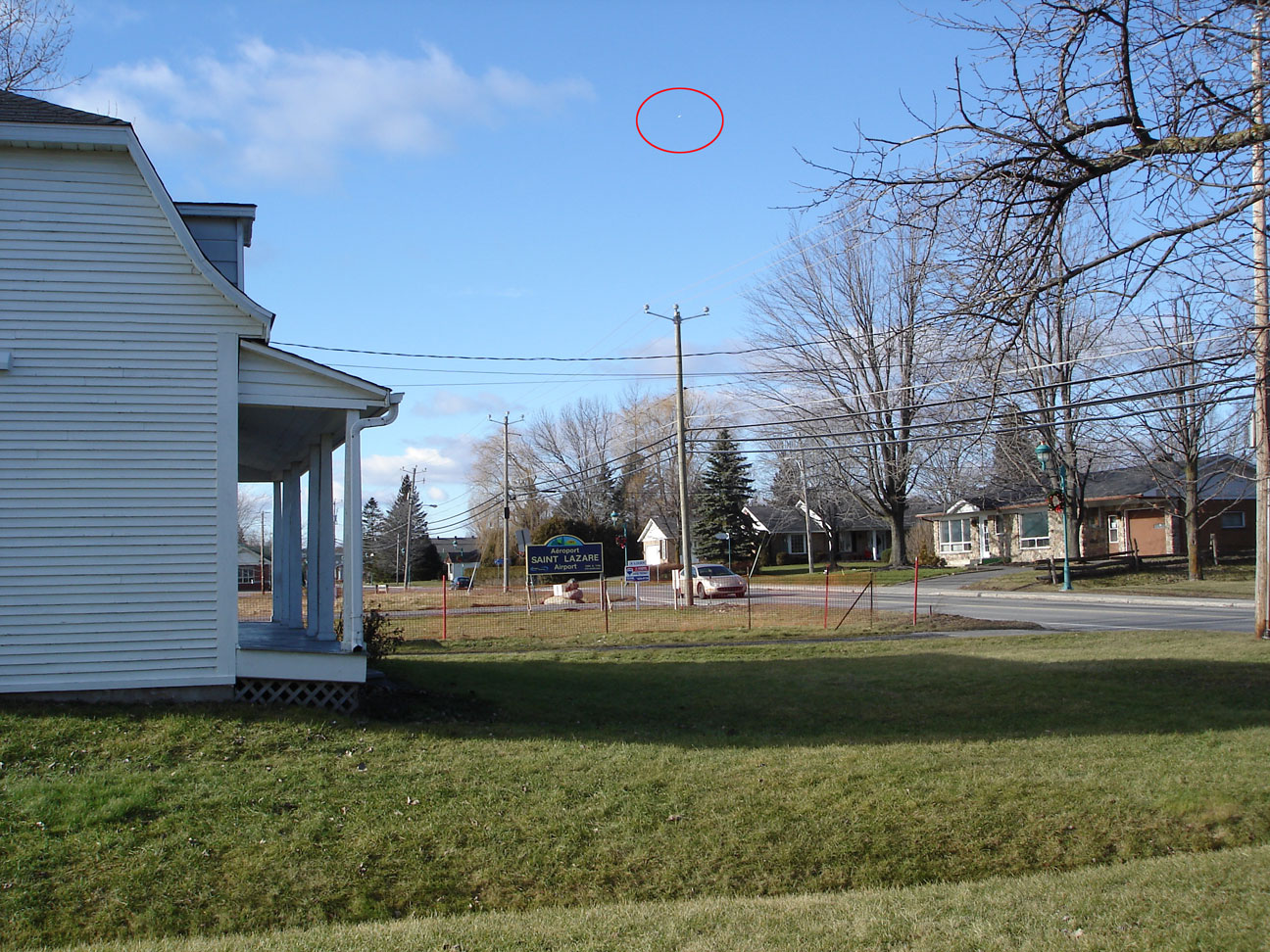 Une énorme étoile se tenait dans le ciel à deux heures, direction est (vers Montréal). Elle se tenait complètement immobile, silencieuse, d'une luminosité très stable. Je me suis avancé sur cinquante mètres, jusqu'à la limite du champ de baseball; ébloui par cette grosse étoile en plein jour, dix à vingt fois plus lumineuse que Vénus dans son éclat maximum. Cette étoile se tenait à environ un ou deux kilomètres. Sa taille apparente: environ dix à vingt mètres d'envergure. Il n'y avait pas d'avions, pas d'animaux ou de planètes (Lune, Vénus, Mars, Jupiter).