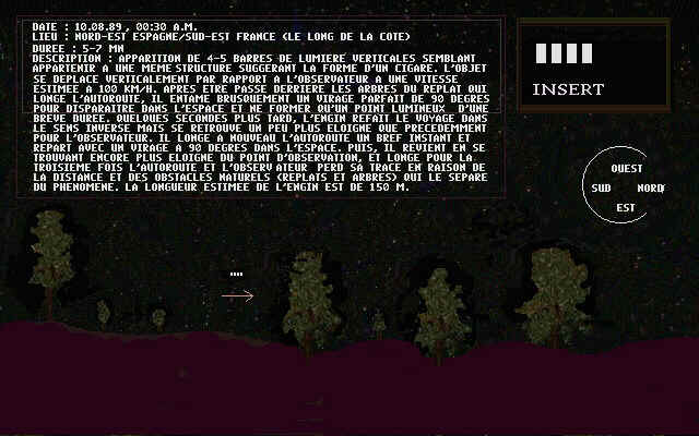 L'"objet" se déplaçait, par rapport à nous, horizontalement (donc, en longeant l'autoroute) en direction du nord à une vitesse estimée à 50-60km/h. Jusque-là, rien d'exceptionnel sinon l'intensité des lumières et leur disposition. 3 minutes après, l'objet s'arrêta et fila, à 90 degrés, à une VITESSE VERTIGINEUSE (comme dans la guerre des étoiles de G. Lucas) dans le cosmos (en même pas 1 seconde l'engin grimpa dans le ciel pour ne former qu'un point).
