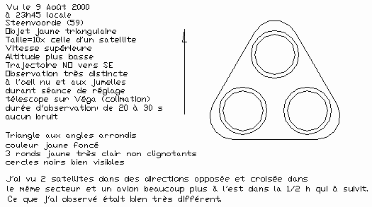 Alors que je regardais Véga, au zénith, je fut attiré par un point très lumineux qui venait de l'arrière. Je pensai d'abord à un satellite, mais son aspect et sa grosseur étaient vraiment très inhabituels. Je me tournai face à cet objet qui parcourait le ciel, chaussai mes jumelles (que je porte toujours en bandoulière lors de mes observations) et fixai l'objet. Malgré les légers tremblements, je vis très distinctement une forme triangulaire aux angles arrondis, qui semblait être éclairée par le soleil (comme un satellite). Cet objet était bien plus gros qu'un simple satellite. Je pouvais voir 3 ronds beaucoup plus lumineux, presque blancs, placés dans les angles (pas aux extrémités, mais à l'intérieur du triangle). Afin d'en avoir le coeur net, je pris le temps de saisir ma chaise longue et de la retourner dans le sens de mon observation (je l'ai toujours à mes côtés). Je m'y allongeai, et, ma tête bien calée sur le dossier, je pus observer encore au moins pendant 15 secondes l'objet en question. (Cette position permet d'observer les étoiles avec des jumelles sans tremblements.)