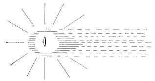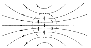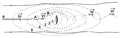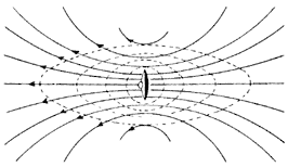 Exemple de lignes de forces et surfaces équipotentielles dans un déplacement axial (très grande vitesse).Les noyaux atomiques de l'air ambiant subiraient, tout comme ceux de l'engin, l'influence du champ créé. Ils tendraient donc vers une certaine vitesse, égale à celle de l'engin à son voisinage, décroissante en fonction de l'éloignement. La résistance de l'atmosphère aidant, il se produirait donc une circulation aérodynamique dont la vitesse, c'est-à-dire le vent relatif, décroîtrait d'une façon différentielle pour devenir très faible au voisinage de la paroi. On aboutirait ainsi à la création d'une couche limite hyper-épaissie (ce qui est exactement l'inverse de ce que l'on s'efforce d'obtenir en aérodynamique classique) dont l'utilité sera étudiée plus loin.