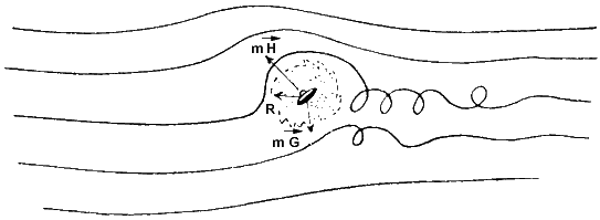 Quant aux virages à angle droit, ils s'expliquent très bien par un basculement de l'engin pour compenser la force centrifuge par l'action dosée du champ (fig. 9).