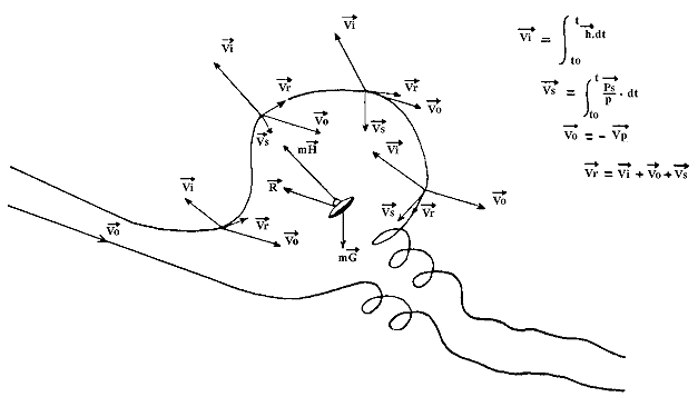 Composition des forces dans le déplacement plat subsonique, et en vol immobile.Le principal avantage du système serait naturellement que, du fait de l'omniprésence de l'énergie cosmique, le problème du ravitaillement ne se poserait plus. Quant à la vitesse, elle tendrait, dans le vide presque absolu des espaces interstellaires, vers la vitesse du fluide traversant l'engin, c'est-à-dire, vraisemblablement, proche de celle de la lumière, si l'on en juge par celle des particules cosmiques les plus rapides.