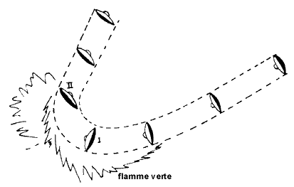Genèse du virage en angle droit: de I à II, le pilote bascule brutalement son engin pour contrer l'accélération centrifuge par l'action dosée du champ. Une flamme verte apparait qui n'est qu'un sous-produit du procédé de capture que la traînée rougeoyante cache en vol rectiligne.