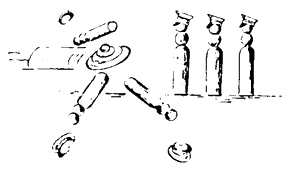 Quant aux cigares, si l'on suppose qu'ils sont constitués d'une carlingue avec deux Soucoupes en bout, on voit immédiatement (fig. 5) qu'ils doivent être inclinés sur l'horizon à basse vitesse, cette inclinaison étant à peu près celle des axes d'éventuelles Soucoupes convoyeuses.