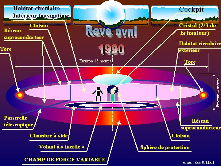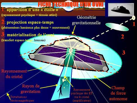 Le tore donne la cohérence temporelle au vaisseau. Le cristal donne la cohérence ondulatoire (mise en uvre des harmoniques) à l'ensemble des particules inscrites dans le champ produit par le tore et dans les limites physiques de la cellule. L'apparition du champ de force variable autour du vaisseau précède localement le vaisseau (sorte de projection de l'espace-temps). Le disque en rotation est extrêmement léger. La rotation initiale du disque est fournie par le tore. Le disque restitue ensuite son énergie au tore une fois un certain seuil de vitesse dépassé. Le vide est la clé dans la "mutation" de l'état de la matière, et donc de sa "localisation".