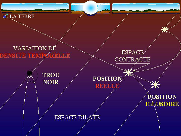 Lorsque que nous regardons une étoile, nous apercevons une couche "interne" de l'univers qui se traduit par une courbure de l'espace-temps, ou en d'autres termes, selon ma vision, un espace-temps "supérieur" comparativement à l'espace-temps qui l'entoure. Ainsi, l'étoile n'est pas à la même position que son environnement spatial. Les trous noirs sont dans une densité de temps bien supérieure et il nous est impossible de les voir dans notre espace-temps puisque nous les devinons par calcul.