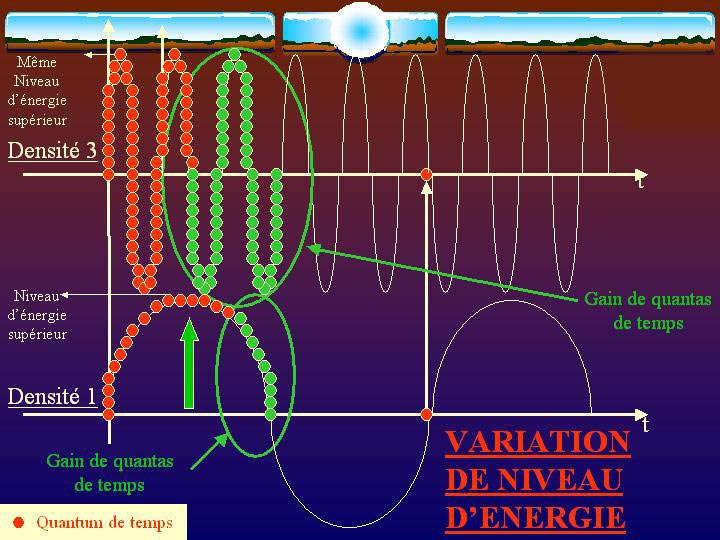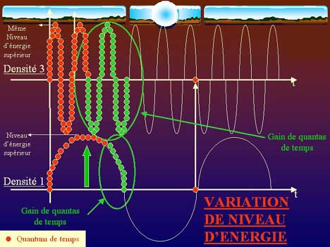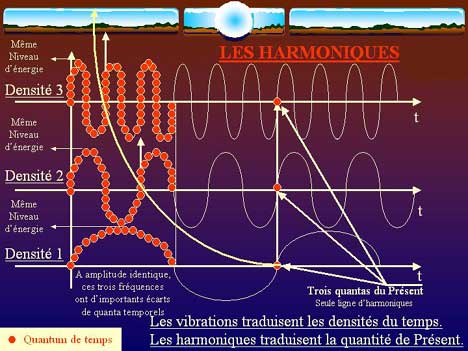 En développant les quantas temporels, on mesure les écarts de densité. On passe d'une densité à une autre en passant par la ligne (axe) du présent, c'est-à-dire par les points d'harmoniques vibratoires. Pour se représenter le Présent (P-Time) de façon géométrique, si une seconde était la distance de la Terre au Soleil, le Présent ne serait pas même visible avec le meilleur microscope du monde. Il n'est donc pas étonnant qu'il puisse nous en manquer des milliards chaque seconde. C'est là que le temps psychologique prend toute sa dimension comme les rêves nocturnes d'ailleurs, sièges d'une augmentation vibratoire.