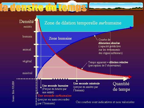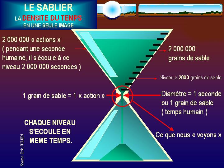 Le sablier évoque parfaitement la densité du temps. Chaque graduation représente une densité temporelle. Pour faire court, nous pourrions dire qu'une densité supérieure à la convention "seconde" serait une fraction de celle-ci pendant laquelle se produiraient autant de choses (actions).