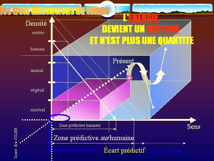 Le présent tel que nous le concevons habituellement n'existe pas! Il est une illusion et une convention de langage. Il ne sera toujours qu'un passé ou futur immédiat jusqu'au temps de Planck (10-43 seconde) puisque ce n'est qu'un problème d'échelle. Cette grande vérité est à méditer longuement. Très longuement.Pour résumer, le temps 3-D. est un hologramme dans lequel notre conscience évolue par bonds successifs dans trois directions simultanées. Loin d'être gratuit et spéculatif, le temps 3-D est scientifiquement vérifiable. Du reste, c'est ce que nous faisons tous les jours grâce à l'informatique! Comme monsieur Jourdain Mais dans mon expérience le mental ne vient qu'après