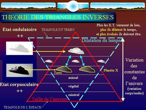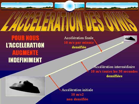 Lorsqu'un ovni s'envole, il nous apparaît en accélération prodigieuse. Mais c'est une apparence! Quelle que soit la constitution physique des occupants de ces machines, ils ne pourraient pas subir sans dommages ces accélérations foudroyantes. Ce n'est donc pas la "variable espace" qu'il faut étudier mais la "variable temps". Exemple: si l'accélération d'un objet nous paraît être de 100m/s2, elle est en réalité, pour ses occupants, de 10m/s2 parce que leurs secondes changent de densité. En d'autres termes, la première de leur seconde sera la même que la nôtre, puis la suivante dilatera pour devenir une de nos minutes, et ainsi de suite pour, en fait, n'accélérer que très peu. Mais l'illusion que nous en aurons sera une prodigieuse accélération jusqu'à leur disparition dans une autre densité de temps, les rendant ainsi invisibles à nos yeux COMME NOUS LE SOMMES POUR LES PLANTES EN PASSANT DEVANT SANS S'ARRETER.