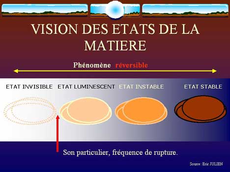 Lorsqu'on rapproche cette apparente "absurdité" et notre incapacité temporaire (espérons-le) de "voir" en deçà de 10^-15 seconde (à convertir en longueur d'onde), on peut élégamment en déduire que la matière DEVIENT INVISIBLE car elle se dématérialise, tandis que la nature ondulatoire de la matière maintient la "mémoire" des propriétés particulaires (théorie des supercordes et inséparabilité des particules). Nous verrons plus loin comment la cohérence des structures atomiques est conservée même en cas de dématérialisation.