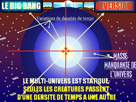 Jean Heidmann, astrophysicien à l'origine du projet SETI, avait déclaré que le Big Bang n'était pas une explosion de matière mais une dilatation d'espace. Cette différence jetait souvent la confusion dans les esprits. A la lumière du temps-3D, et en particulier de l'une de ses dimensions, la densité du temps, l'expansion de l'univers n'est qu'apparente. Pour mémoire, l'expansion de l'univers serait due à un différentiel important entre les forces thermodynamiques tendant à faire s'éloigner la matière et les forces nucléaires qui, au contraire, la rapproche. Le dilemme vient de ce que 90% de la masse de l'univers reste cachée. Ce constat vient de l'écart calculé entre les forces thermodynamiques et les forces de cohésion atomique. Le mouvement entropique ne serait donc qu'une illusion. Une de plus. En effet, force est d'admettre que tous les espaces-temps coexistent. En effet, le Big Bang est un dogme au sens où il est parfaitement arbitraire de penser que la soupe primordiale s'est accumulée en amas, en galaxies, en étoiles et en planètes. Si, comme on nous le propose, la matière se trouverait sur la surface d'un ballon de baudruche cosmique pourquoi ne serait-elle pas répartie équitablement sur celle-ci? On nous répond que la gravitation a fait son oeuvre! Or, nous ne connaissons pas la nature intime de la gravitation sauf à nous indiquer qu'elle est une courbure de l'espace-temps. D'où l'idée que la gravitation est liée à la densité de temps et n'explique en aucune manière la formation des corps célestes. Plus nous regardons loin dans l'espace (densité de temps plus faible) plus nous voyons les couches externes de l'univers. Mais aussi plus nous regardons loin, plus nous voyons dans le passé (sens du temps remonté). Et dans ce cas nous voyons les couches internes de l'univers. Ainsi, la conjugaison entre couches externes et couches internes nous rend l'entropie illusoire.
