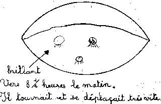 blanc, en forme sphérique un peu écrasée. Les nombreuses apparitions étranges signalées à Massimo Cantoni depuis le début de cette année "n'ont pas encore trouvé d'explication logique et rationnelle: toutefois, souligne l'ufologue de Cernobbio, les différentes personnes qui m'ont contacté sont dignes de foi et leurs versions plausibles." Reste à savoir pourquoi les apparitions se concentrent dans le sud du Tessin plutôt qu'ailleurs. (Agence télégraphique suisse, 16 février 1989) Les deux témoins roulaient sur l'autoroute en direction de Genève, cette nuit du samedi 29 au dimanche 30 octobre 1994 entre 0h35 et 0h45. Depuis la Blécherette jusqu'à Morges, ils observent "une forme constituée d'un ensemble de spots faiblement lumineux, organisés géométriquement en trois losanges concentriques d'environ 30 à 50 mètres de côté". L'objet se trouvait entre l'autoroute et le lac. Il tournait sur lui-même dans le sens contraire des aiguilles d'une montre et paraissait glisser souplement, sans bruit, dans l'espace. Sa trajectoire était rectiligne, dans le sens de l'autoroute. A un certain moment, l'objet s'est approché, sans ralentir son mouvement de rotation. Il se trouvait alors à environ 150 mètres et il a changé son sens de rotation. L'observation a pris fin lorsque la voiture est sortie de l'autoroute à Morges. Trois quarts d'heure après leur observation, les témoins téléphonèrent à plusieurs discothèques de la région pour savoir si l'une d'entre elles utilisait ce soir-là un "éclairage laser". Toutes les réponses furent négatives. Couleur 3, l'aérodrome militaire de Payerne, la police de Morges et la tour de contrôle de Cointrin furent également contactés et incapables d'apporter une réponse aux interrogations des témoins. LDLN N° 328 Le 4 mai 1996, R.S. arrive sur son lieu de travail à Bâle. Il est 5h12. Le ciel est couvert, et il fait froid. Tout à coup, un phénomène lumineux apparaît dans le ciel. Le témoin se précipite dans la cour et commence à observer une grande forme ovale, trouée en son milieu, légèrement inclinée, avec plein de petits ronds tournant sur eux-mêmes. Couleur: gris clair. L'observation dura cinq minutes, jusqu'à 5h17, et le témoin dut cesser l'observation pour se rendre à son travail. Il a longtemps hésité avant de raconter son histoire. Commentaire des enquêteurs: "A première vue, on a l'impression d'avoir affaire à un sky (projecteurs de discothèque), mais est-ce bien raisonnable de penser à un effet de sky à 5h12 du matin, alors que ce genre d'appareil ne sert qu'à attirer la clientèle? Un autre indice important: le témoin n'a vu aucun faisceau." LDLN N° 341 17 juin 1996, au-dessus des Alpes bernoises. Alors qu'il survole les Alpes bernoises dans une zone sans couverture radar, l'équipage d'un avion de la compagnie Air Engadina observe un objet étrange qui se déplace rapidement sur une trajectoire de collision. Selon l'équipage, il ne peut s'agir d'un avion. Le lendemain, les autorités (s.a.p.) ont démenti la présence d'un OVNI dans le secteur. LDLN N° 339 8 mars 1997, Genève, quartier du Bouchet. C'était le lundi 4 août 1997 à 23h10, nous étions en train d'observer le ciel à la recherche d'étoiles filantes quand nous est apparu un ovni. Caractéristiques de l'ovni : il se distinguait parfaitement du ciel à cause de sa couleur grise, il était triangulaire et à chaque extrémité de l'appareil une lumière (de la taille d'une étoile vu de la terre) brillait. La lumière ne clignotait pas comme sur un avion. Comportement de l'ovni : l'appareil se déplaçait d'Ouest en Est. A première vue il se déplaçait lentement, puis après quelques secondes il accélérait et ralentissait de nouveau, à ce moment, venu d'ailleurs un point de la taille d'une étoile l'a rejoint et ils disparurent dans le ciel. L'observation dura environ 10 secondes. Je tiens à préciser que les conditions climatiques étaient bonnes et que durant l'apparition nous étions trois personnes à l'observer. Quand aux personnes sceptiques qui penseraient que nous avons pu confondre cet ovni avec un avion ou un satellite nous précisons que nous sommes de fervent amateurs du ciel et que nous savons distinguer un avion d'un satellite et d'une étoile (filante). Stéphane (de Genève) Le 11 octobre 1997, vers 4h50, dans un ciel magnifiquement étoilé, j'ai vu environ 7 petits nuages blancs lumineux qui tournaient en forme d'ellipse, de droite à gauche et qui se dirigeaient, sud, sud-est.Ce phénomène a duré environ 30 minutes jusqu'à ce qu'il disparaisse à l'horizon. J'ai longuement réfléchi au meilleur moyen de vous donner plus de détails.J'ai donc fait une photo de jour, du site où j'ai observé l'événement, comme ceci vous pourrez mieux vous rendre compte des proportions.