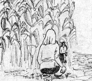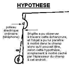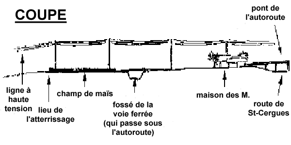 Ils observèrent ces évolutions à plusieurs reprises au cours de la journée et ce jusqu'aux environs de 17h. Tout en se livrant à leurs occupations quotidiennes, ils levaient parfois les yeux et tantôt ils pouvaient observer le phénomène, tantôt ils ne voyaient rien. A un moment donné, une des trois strauss est restée cachée dans ou derrière un petit nuage pendant une demi-heure selon eux. Elle est passée dans ou derrière ce nuage à grande vitesse, n'a pas ralenti, mais n'est pas reparue de l'autre côté. Le ciel était peu nuageux et les objets passaient au-dessus des nuages. Ces observations créèrent chez Mme V. une impression de malaise ("comme si on était mal dans sa peau"). Atterrissage du mardi 11 octobre 1977Vers 14h30, Mme V., Brigitte et Nathalie s'inquiètent de voir une épaisse fumée s'élever du champ de maïs voisin (voir plan). C'est une colonne de fumée semblable à celle d'un feu de broussailles, s'élevant d'un point précis. Brigitte s'empare des jumelles et tente de voir exactement ce que c'est. Il lui semble distinguer un dôme métallique qui dépasse du champ à travers la fumée. Les nerfs à vif après les observations de la matinée, elles pensent immédiatement à leur strauss, avant même d'avoir aperçu le dôme. Elles décident avec appréhension d'aller y voir de plus près. Et toutes trois se dirigent vers le champ de maïs. Mme V., la première, rebrousse chemin en courant: "Vous ne vous rendez pas compte, cela faisait drôlement peur. Je n'ai jamais couru aussi vite de ma vie! Même Jazy ne m'aurait pas rattrapée!" Elle rit nerveusement en nous narrant cet épisode. Nathalie va jusqu'à la voie de chemin de fer, puis fait demi-tour en prétextant que les chats la suivent et qu'il ne faut pas qu'ils se perdent. Brigitte continue seule (car, comme l'a dit César : "De tous les peuples de la Gaule, les Belges sont les plus braves !"). Elle traverse la voie ferrée, remonte le fossé, et longe le champ de maïs au bord de l'autoroute. A ce moment-là, la fumée a cessé. Brigitte remarque alors qu'une voiture s'est arrêtée sur l'accotement. L'automobiliste s'approche d'elle et lui demande ce qu'elle cherche en l'air (Brigitte regardait si la strauss du matin était toujours là). Elle lui résume les événements et l'homme lui dit qu'il a vu un engin semblable le matin en se levant, qui est resté une demi-heure immobile. Après quoi le conducteur reprend sa route.