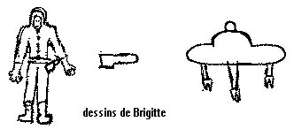 Brigitte va jusqu'au bout du champ et s'arrête stupéfaite: à travers les épis, elle voit un être d'apparence tout à fait humaine excepté la couleur de son visage, qui lui fait face, à environ quarante mètres. L'"homme" est vêtu d'une combinaison métallisée et porte cagoule, gants, botte, ceinture également métalliques. Les cinq boutons de sa combinaison sont de même couleur, que Brigitte compare à celle du boîtier de sa montre à quartz. L'être est de taille normale, mais sa peau est d'un verdâtre tirant sur le bleu. Il n'y a que son visage qui est nu. Il porte à la ceinture, sur le côté gauche, un objet long d'une vingtaine de centimètres (voir dessin). Il est immobile, mais ses lèvres remuent, et Brigitte se demande ce qu'il peut bien raconter tout seul au millieu du champ, mais elle n'entend aucun son.