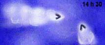 A ce moment (6h45 env.), M. V. dit à sa femme qu'elle a mal vu et que l'objet bouge. En effet, à présent il se déplace très très lentement vers la gauche et contourne la maison en restant apparemment à la même distance (aucun changement de taille). M. V. part au travail, et peu après, leur fille Nathalie (env. 13 ans) qui a aussi vu le phénomène s'en va à l'école vers 7h10, heure à laquelle Mme V. interrompt l'observation pour aller faire son ménage. "J'ai autre chose à faire moi, vous comprenez". A ce moment l'objet s'approche du Jura, du côté du nord-est. Vers 9h, Brigitte (19 ans), la nièce belge des V., en vacances chez sa tante, se réveille et l'observe à la jumelle mais ne distingue aucun détail; la même forme, ni lumière, ni fumée, ni son, ni odeur. Il est de l'autre côté de la maison, vers Divonne. Les témoins à cette heure sont Brigitte, Mme V. et M. M., leur voisin, que Mme V. est allée chercher pour lui montrer le phénomène, car elle a peur de passer pour une "dingue". Soudain, Brigitte voit la "strauss" (c'est un terme que l'on utilise beaucoup chez les V. et qui équivaut à machin) se séparer en trois parties. Elle est seule à présent, car les autres vaquent à leurs occupations. Les objets n'ont plus alors l'aspect du grain de riz, mais plutôt d'un petit nuage, ou d'une large traînée de condensation, avec une pointe noire à une extrêmité (voir plan et dessins). Mme V. et M. M. reviennent alors pour assister à un incroyable ballet: les trois strauss s'éloignent l'une de l'autre, filent dans trois directions opposées, puis se rejoignent sans ralentir, à une vitesse supérieure à celle d'avions (Mme V.:"si c'étaient des avions, il se seraient collisionnés !").