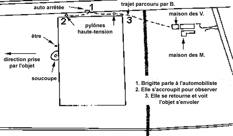 Epouvantée par l'aspect rebutant du personnage ("Il était pas beau!"), Brigitte se relève (elle s'était accroupie pour observer) et s'enfuit en courant. Arrivée au coin opposé du champ, elle se retourne, et voit l'objet s'élever doucement à la verticale. A ce moment, elle peut constater qu'il est muni de trois pieds assez courts (50 cm), cylindriques, se terminant chacun par trois petites pointes. La soucoupe s'éloigne doucement vers l'ouest. Brigitte reprend alors sa course, remarque au passage que les vaches sont énervées, et regagne la maison. Elle ne voit donc pas l'objet disparaître. Fortement émotionée, elle descend un verre de wisky pour se remonter.