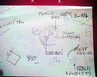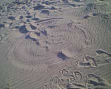 a present ,j'aimerai vous faire part de mes impressions et interpretations! ......en depis de toute analyse de mon entourage et de mes propres investigations apres avoir cherche sur le terrain des indices secondaires exemple sable decolore ,fondu,absence de produit residuel,caillou metalic syntetise alteration mineral etc.. ou vegetal...rien de tout cela,donc nous ne pouvons considere que la trace,etant limite moi-meme par mes moyens ë connaissance..cf dessin relatif à observ. du 29-04-05 ref.piece jointe010705-0002 je reste à la conclusion suivante: il est fort probable qu'aux alentours de la fin du mois d'avril 2005 cette zone est etait le theåtre d'un phenomene bien particulier,soit le survol d'1object qui emettait des forces sur un plan horiz-vertical(forces polarises champs de force electromagnetiques ou gravitationnelle notez le disque sinusoïdal sur un plan horizontal a la surface irregulière du sable comme traverse d'une ligne de force polarisèe perpendiculaire qui a eu pour consequence de produire le monticule au n.n.e. et les creux situes au sud -sud-ouest ( repulsion-atirance =sens de circulation d'une li gne de champs magn. ou des electrons) peu-etre l'object etait a des kms de la? la matiere utilisee par ces technologie doit revetir de formes extremes pour rendre compte d'une certaine realite il faut raisonner aux termes de la physique de la relativitè ë de la mecanique quantique.