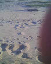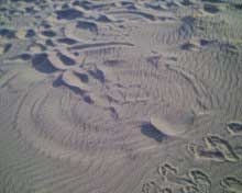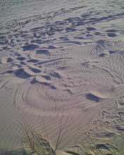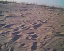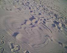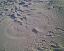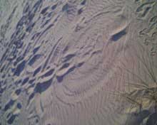 notez la forme et sa topologie bien particuliere. le climat etait au beau fixe,les brises ë vent cotier souflaient moyens ces jours là è le sable sec,d'1 jaune asse soutenu et fin, j'ai deduis quelle devait avoir env. 1semaine vu le sable contenu ds ses sillons,chose remarquable l.'empreinte fut preserve du pietinement de temoins precedents