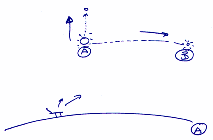 Au-dessus de nos têtes, nous avons remarqué (A) un objet lumineux de la grosseur apparente d'un citron (+/-), immobile, ne scintillant pas, mais plus gros que les étoiles. Un autre point lumineux (B), de la grosseur apparente d'une cerise (+/-), s'est détaché de cette boule et a traversé le ciel. Il avait l'air de suivre la courbure de la Terre et a disparu très loin, au-delà de l'horizon.