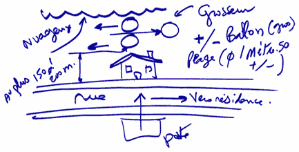 En ressortant (!), de l'autre côté de la rue, il y avait un bungalow (rue de petites maisons), avec, dans la fenêtre de la cuisine allumée qui donnait vis à vis de la sortie du bureau postal, un monsieur qui essuyait tranquillement sa vaisselle (je présume encore), et au-dessus, possiblement à 200 mètres, 2 disques, ou boules métalliques, sans luminosité, qui passaient doucement au-dessus, et en arrière plan, un troisième disque qui allait dans le sens opposé. Et un léger voile vert pâle dans les nuages.