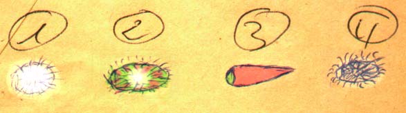 Au bout de deux secondes environ, elle vira au vert en s'allongeant légèrement, prenant une forme ovoïdale, mais son centre était encore de couleur blanche. Toujours par période de deux secondes, sa forme et ses couleurs se modifièrent, elle prit une forme plus allongée, genre flamme de chalumeau, le côté le plus arrondi qui était pour ainsi dire l'avant était de couleur verte et le reste vira au rouge orange, puis elle se modifia à nouveau pour reprendre sa forme initiale, mais en moins lumineux, puis disparut tout à coup.