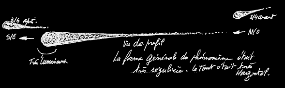 Il est impossible que se soit une véritable comète, car j'ai eu l'occasion d'en observer et celles-ci sont moins régulières, très petites vues du sol sans instruments, et surtout, leur queue est toujours opposée au soleil. Or, la direction de la queue du phénomène observé n'obéissait pas du tout à cette loi naturelle. De plus, le corps et la queue d'une véritable comète sont constitués d'une vapeur et de blocs arrachés à la tête par le rayonnement solaire. L'aspect très net de l'objet en question ne ressemblait pas du tout à cela, mais était constitué d'éléments distincts, identiques (au moins en apparence) et se déplaçaient régulièrement en même temps que le phénomène qu'ils constituaient, un peu comme un banc de poissons.